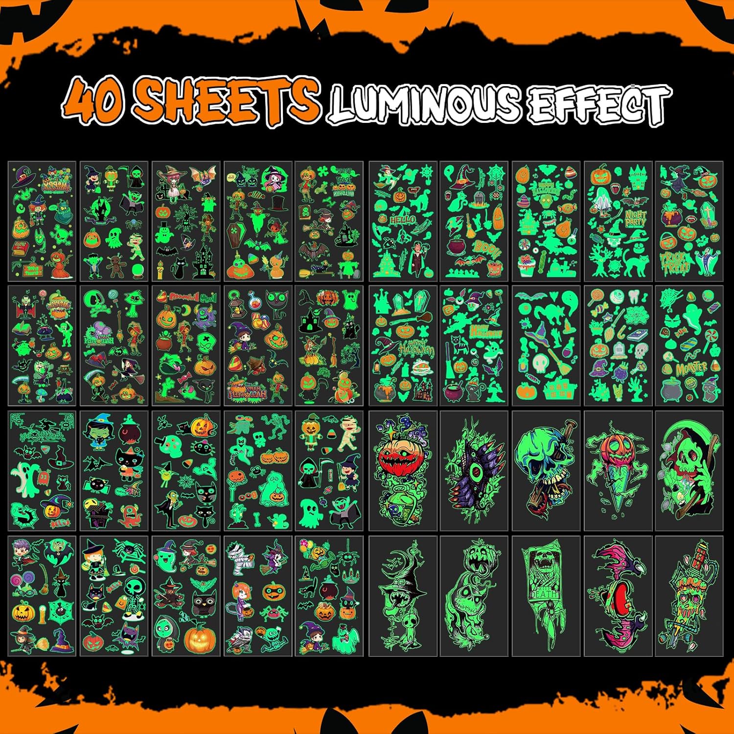 40 luminous Halloween tattoos/stickers, including pumpkins, vampires, zombies, witches, bats, monsters, lanterns, black cats, etc., in different styles to meet your Halloween decoration needs.
