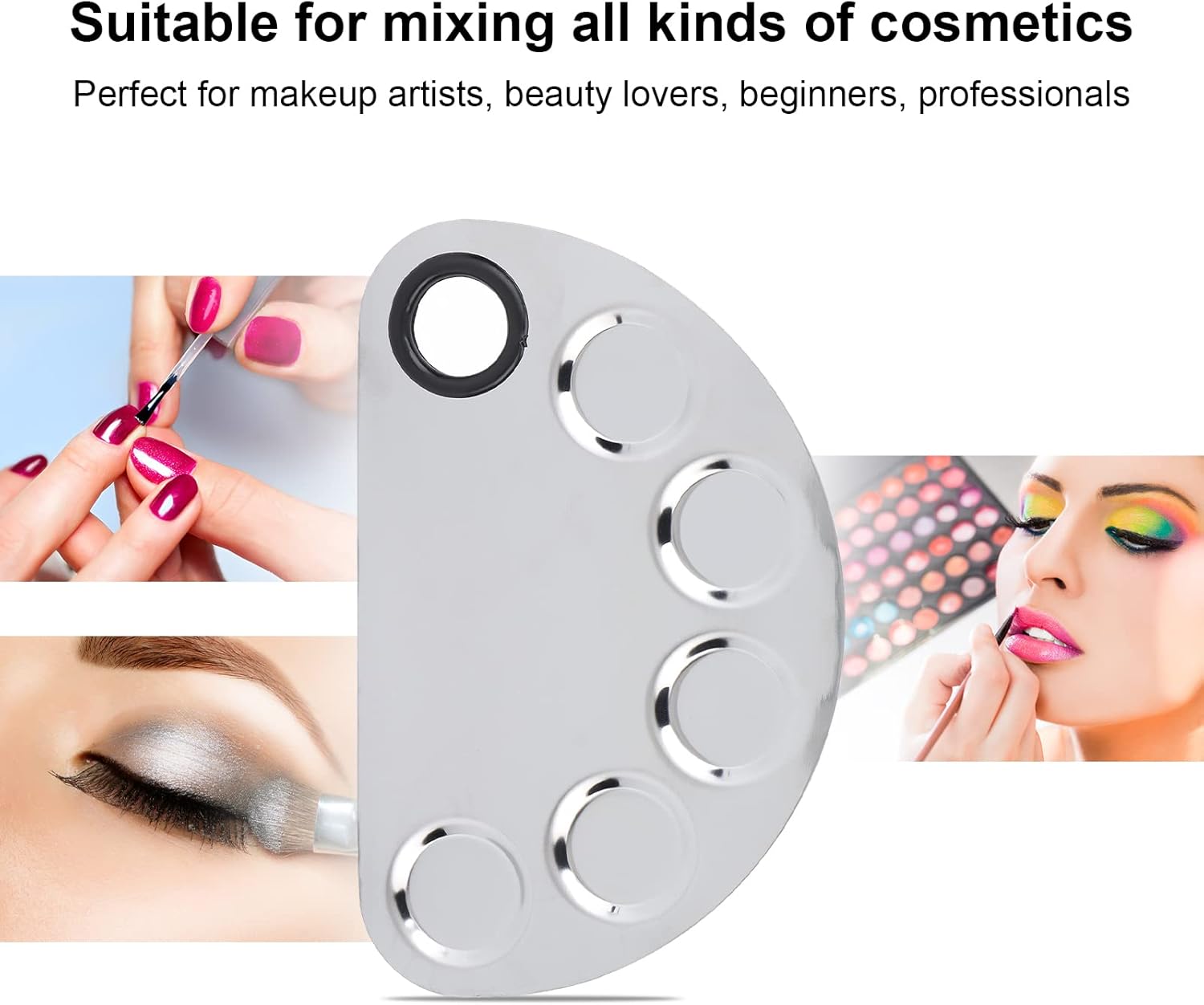 [PROFESSIONAL QUALITY] Crafted from high quality stainless steel , this cosmetic mixing plate is long-lasting , easy to cleanse , and reusable . Its textured handle provides a comfortable grip , while the thumb hole in the palette makes it easy to handle . It's an ideal tool for professionals and beginners alike .