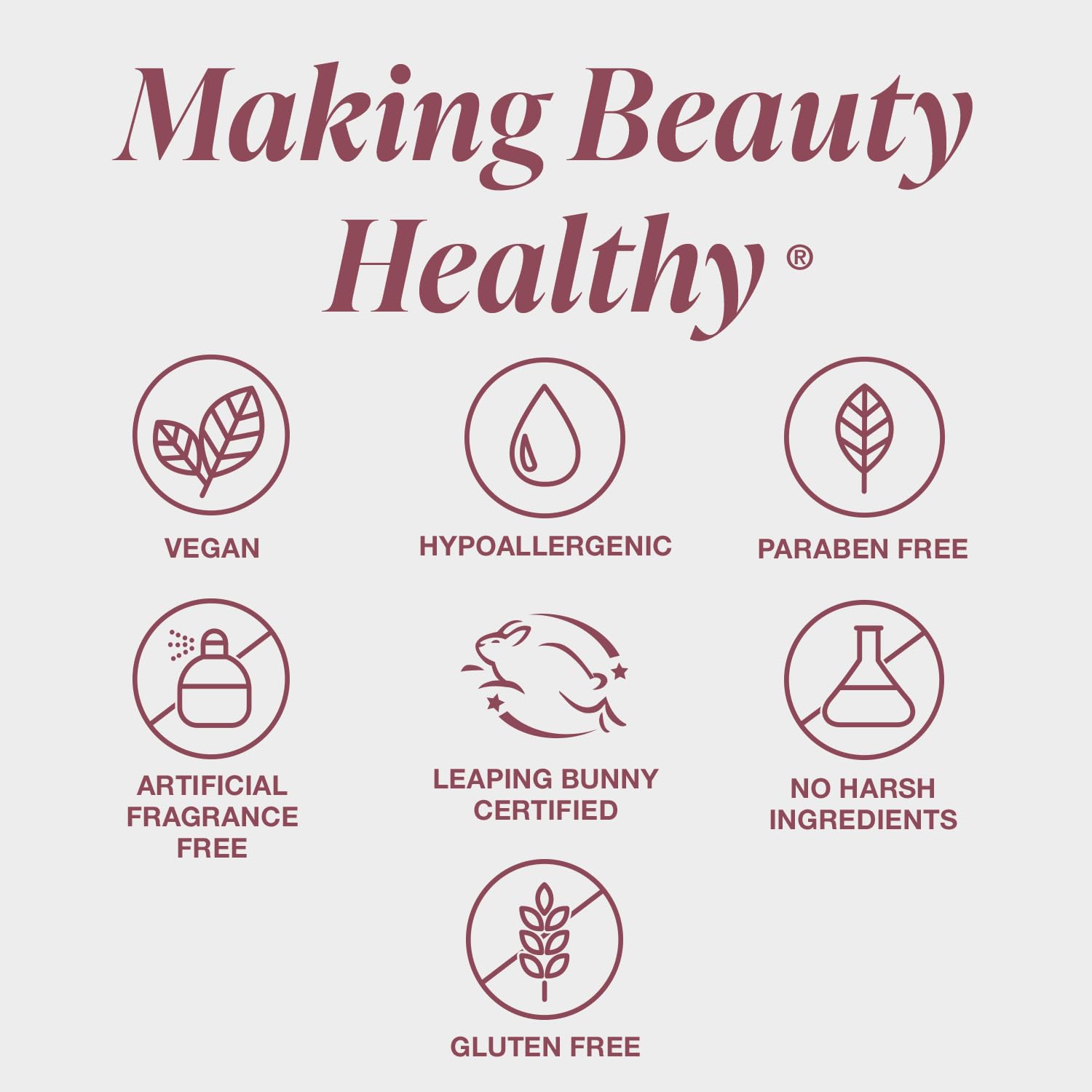 Vitamin E, White Tea & Aloe Vera nourish and soothe sensitive skin. Hypoallergenic, Vegan, Leaping Bunny Certified, Gluten Free.
