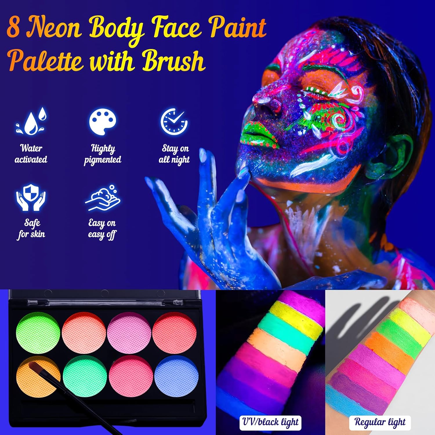 [Vivid U-V Reactive Neon Face & Body Paint] Water Activated Neon Face and Body Paint featuring 8 electrifying colors that glow intensely under U-V black light, perfect for raves, festivals, or neon-themed events, this paint delivers smooth application and vibrant neon shades in natural light. Activate with water, apply with included brush, and enjoy long-lasting, easy-to-remove makeup that stands out in setting. Ideal for both beginners and professional artists, it’s a must-have for Halloween, cosplay, or sports events where U-V face paint and neon body paint make you the center of attention.