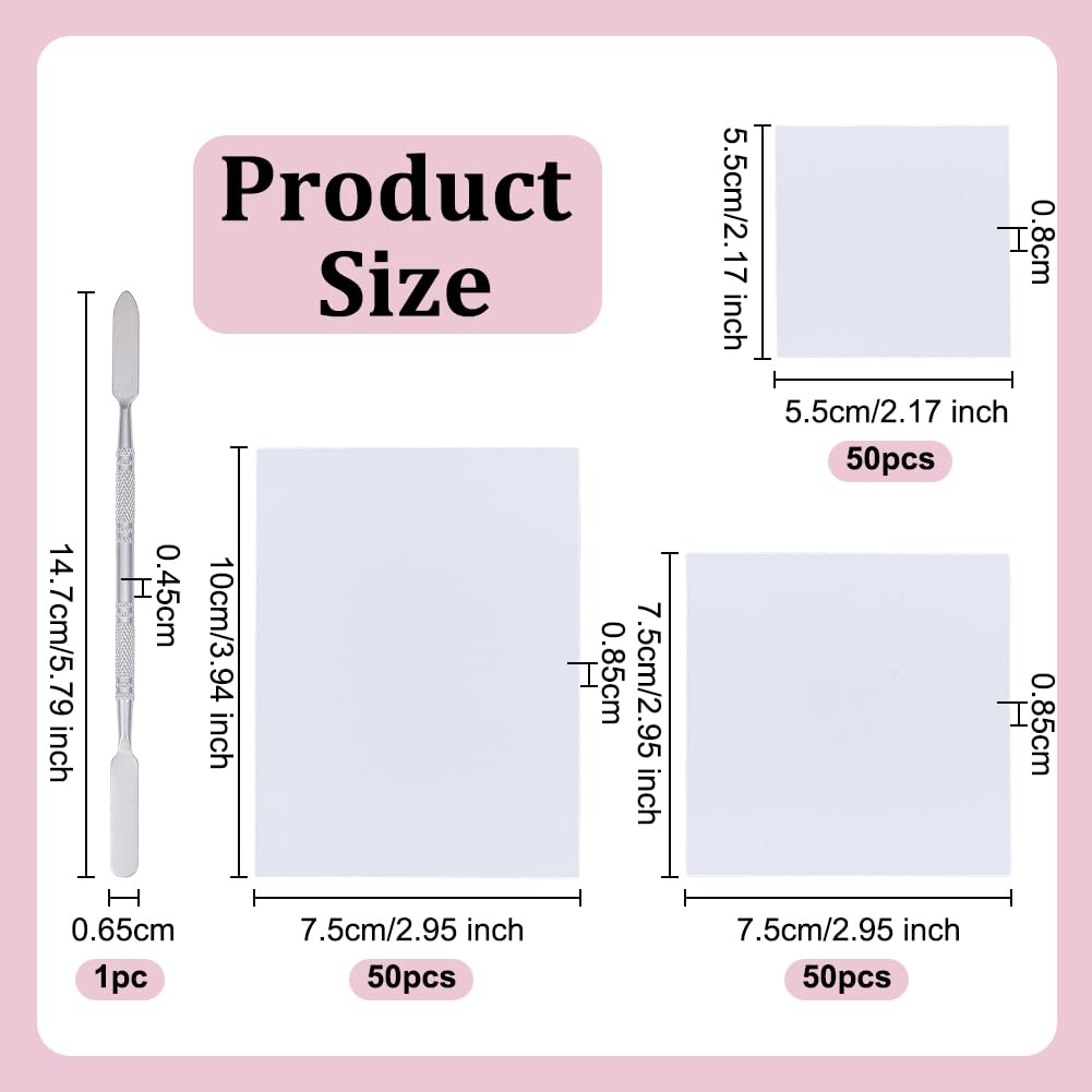 Package Content--This set includes 150 sheets of waterproof nail art paper in three universal sizes: 50 sheets (5.5x5.5cm/2.17x2.17 inch), 50 sheets (7.5x7.5cm/2.95x2.95 inch) and 50 sheets (10x7.5cm/3.94x2.95 inch) plus a double-ended stainless steel mixing stick measuring 14.7x0.65x0.45 cm/5.79x0.26x0.18 inch