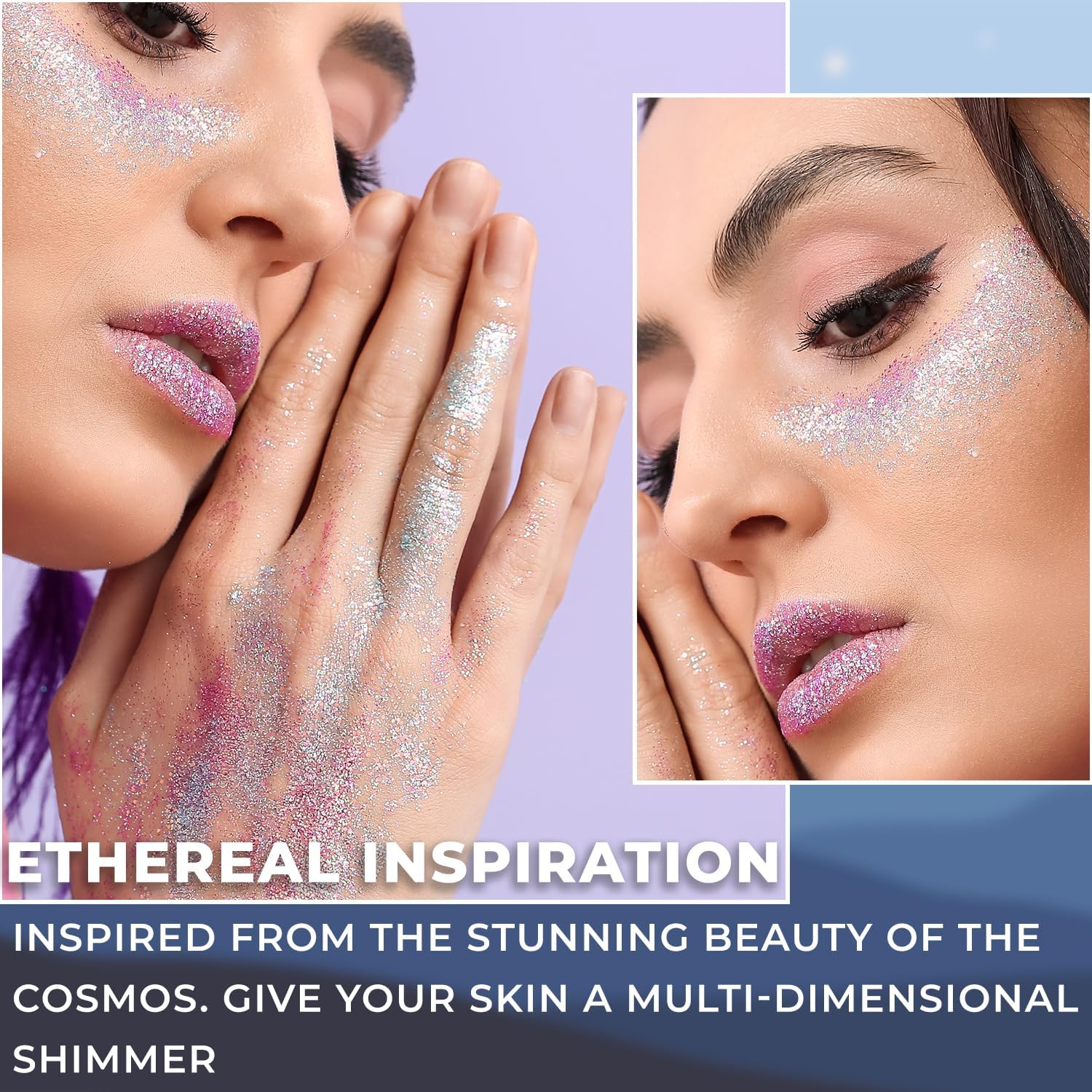 COSMIC INSPIRATION: Inspired by celestial tones, UFO Body Glitter adds a luminous, space-inspired touch to your beauty routine with a radiant, glowing finish.