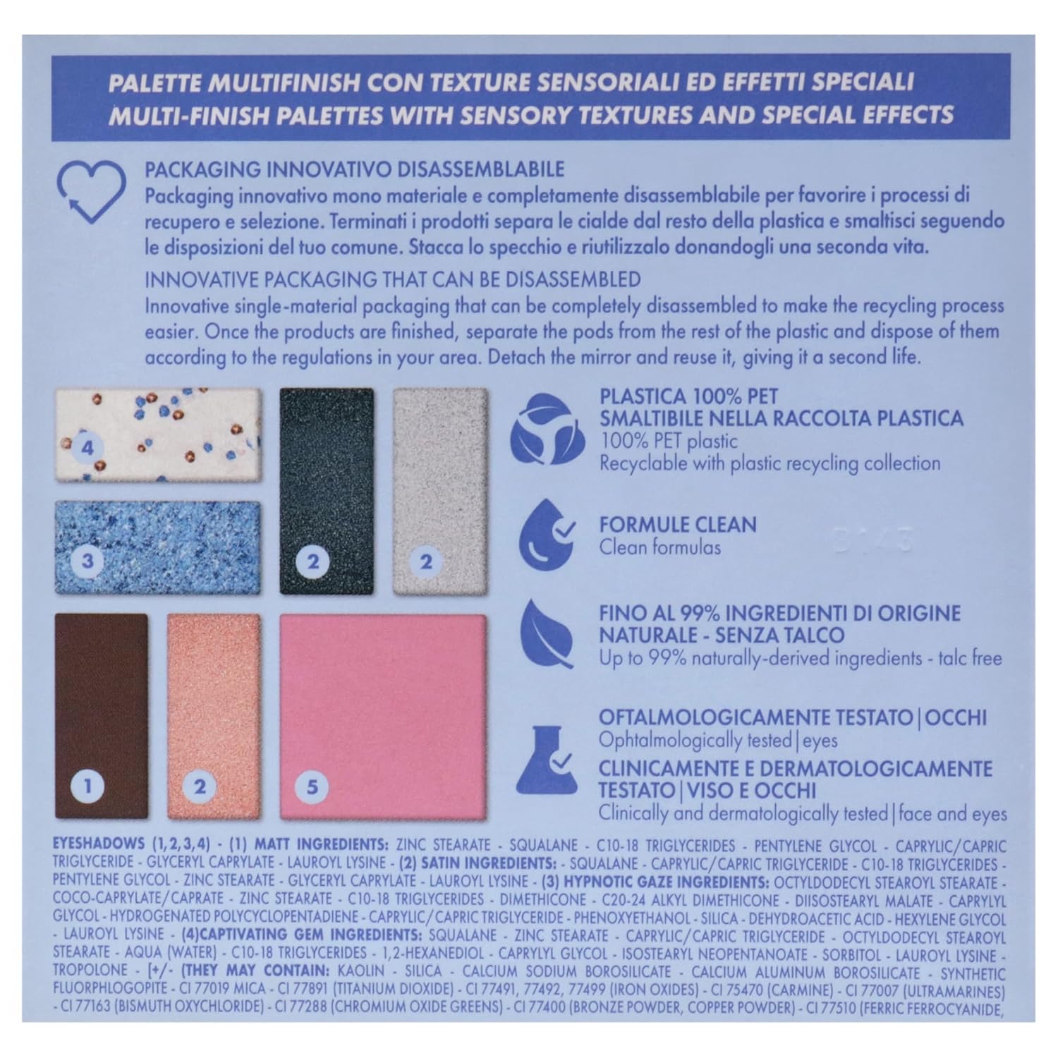 Palette type: Compact, travel-friendly palette with 7 pans of eyeshadow and 1 blush