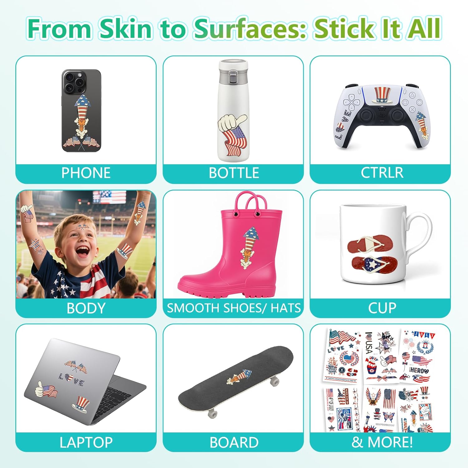 Multi-Surface Fun - Apply not only on skin but also on cups, phones, hats, glass, metal, plastic, and wooden items. Once applied, tattoos last for over 7 days, Great for parties, creative play, or decorating personal belongings.