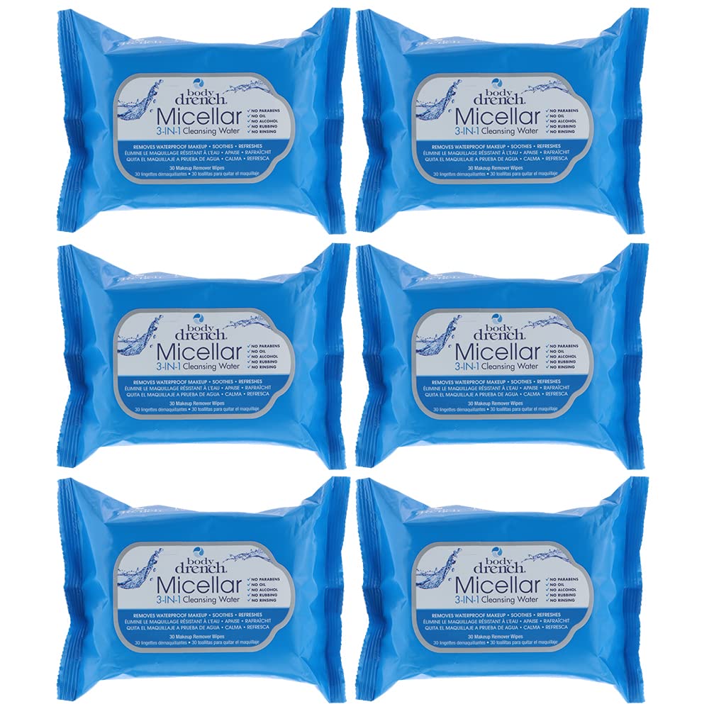 Body Drench 3-in-1 Micellar Water Makeup Remover Wipes – Removes Waterproof Makeup, Facial Cleanser, 30 Ct. (6 Pack)