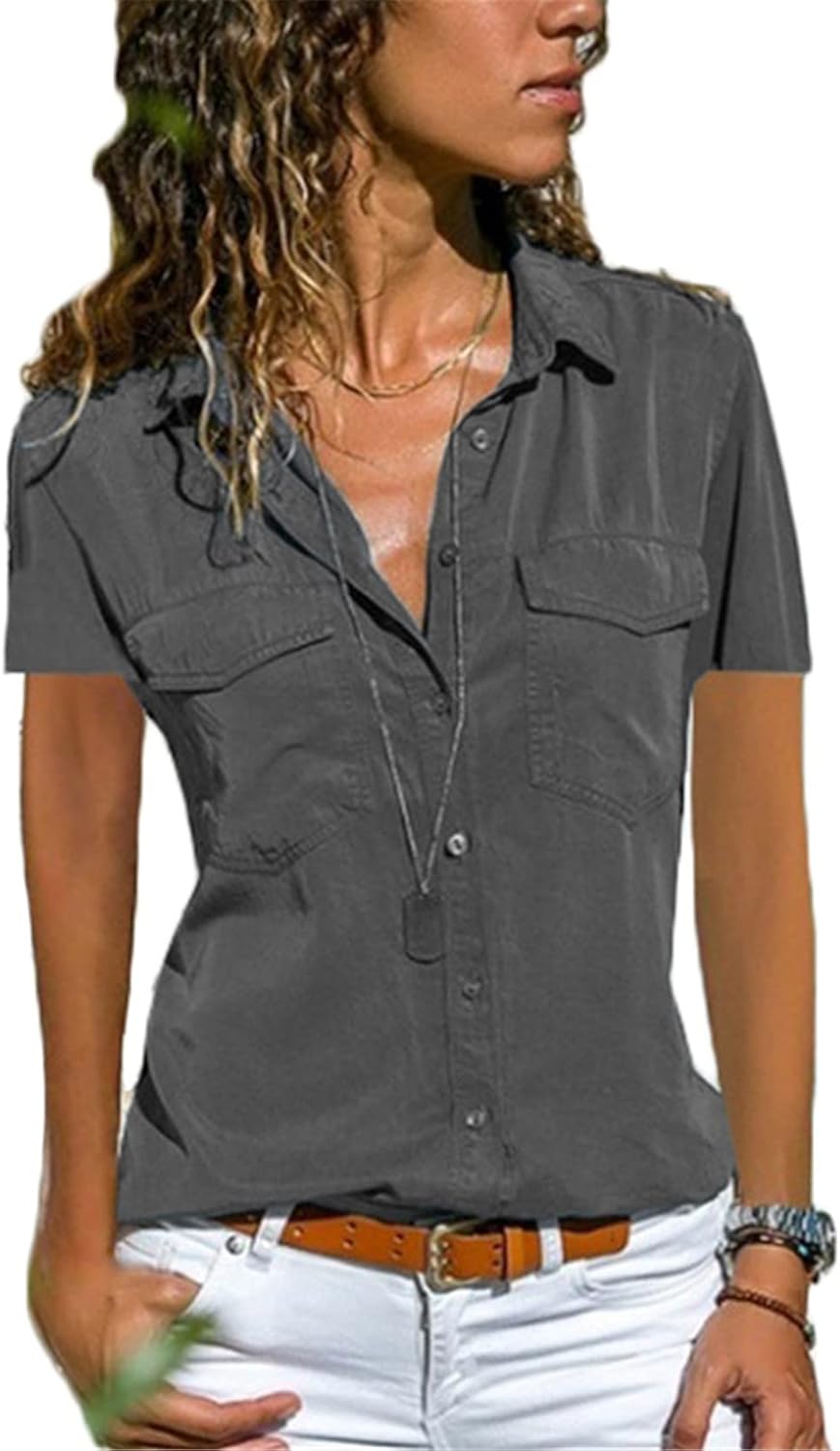 Andongnywell Women's Solid Color Short Sleeve T Shirt Casual V Neck Cuffed Sleeve Button Down Blouses Top with Pocket