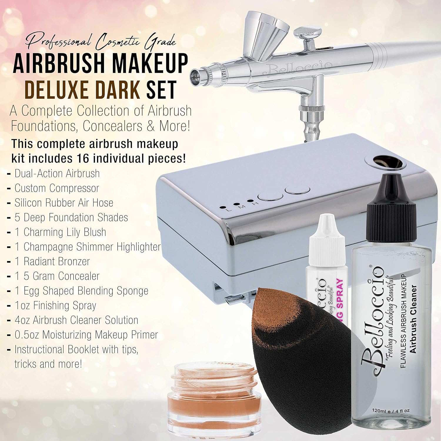 Belloccio Professional Beauty Deluxe Airbrush Cosmetic Makeup System with 5 Dark Shades of Foundation in 1/2 oz Bottles - Kit includes Blush, Bronzer and Highlighters
