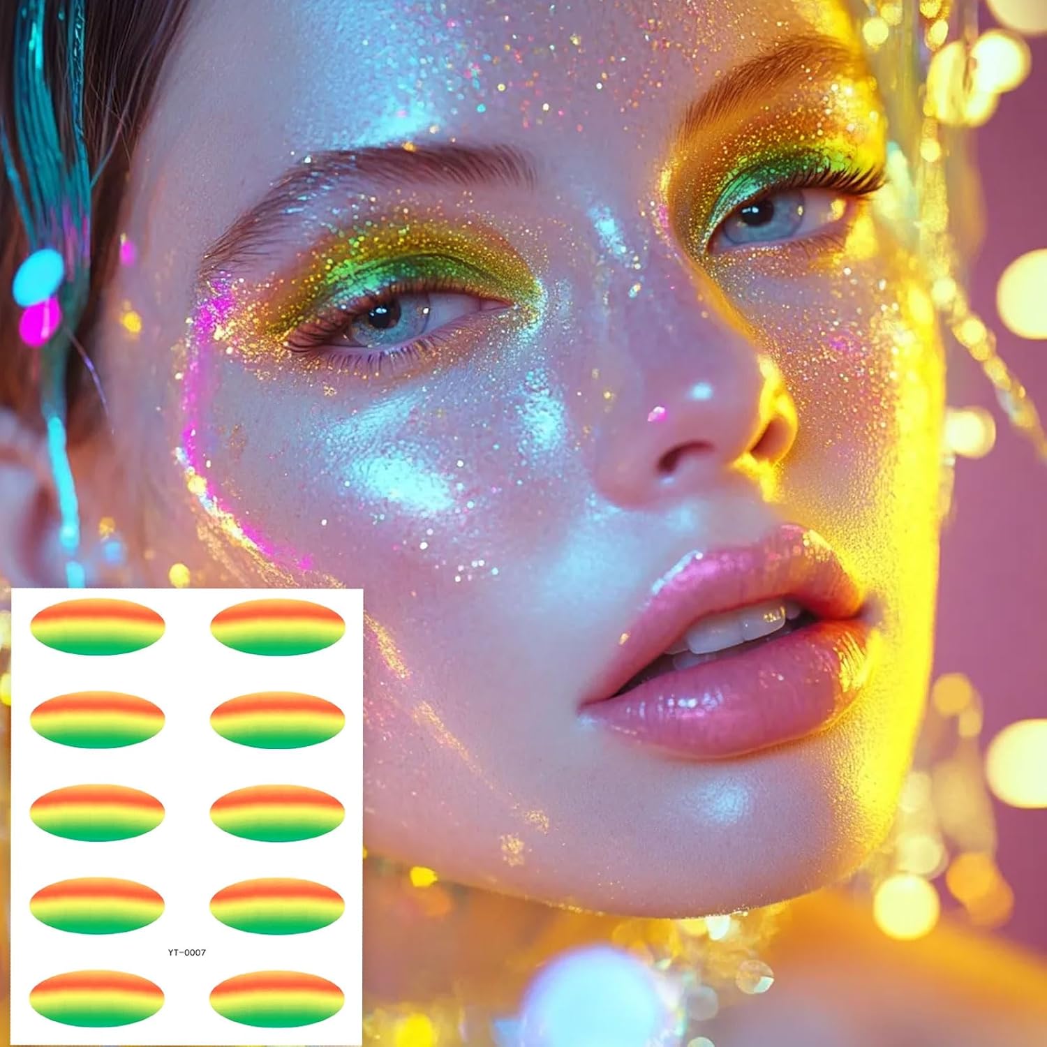 • 【Instant Glam Eye Makeup】You will get 2 sheets lazy eye shadow tattoo stickers(Contains 20pcs eye shadow)Create dazzling eye looks in seconds! – no makeup skills needed!The rainbow design adds playful charm, while the gradient blue offers a mysterious, edgy vibe—perfect for matching costumes, outfits, or event themes.