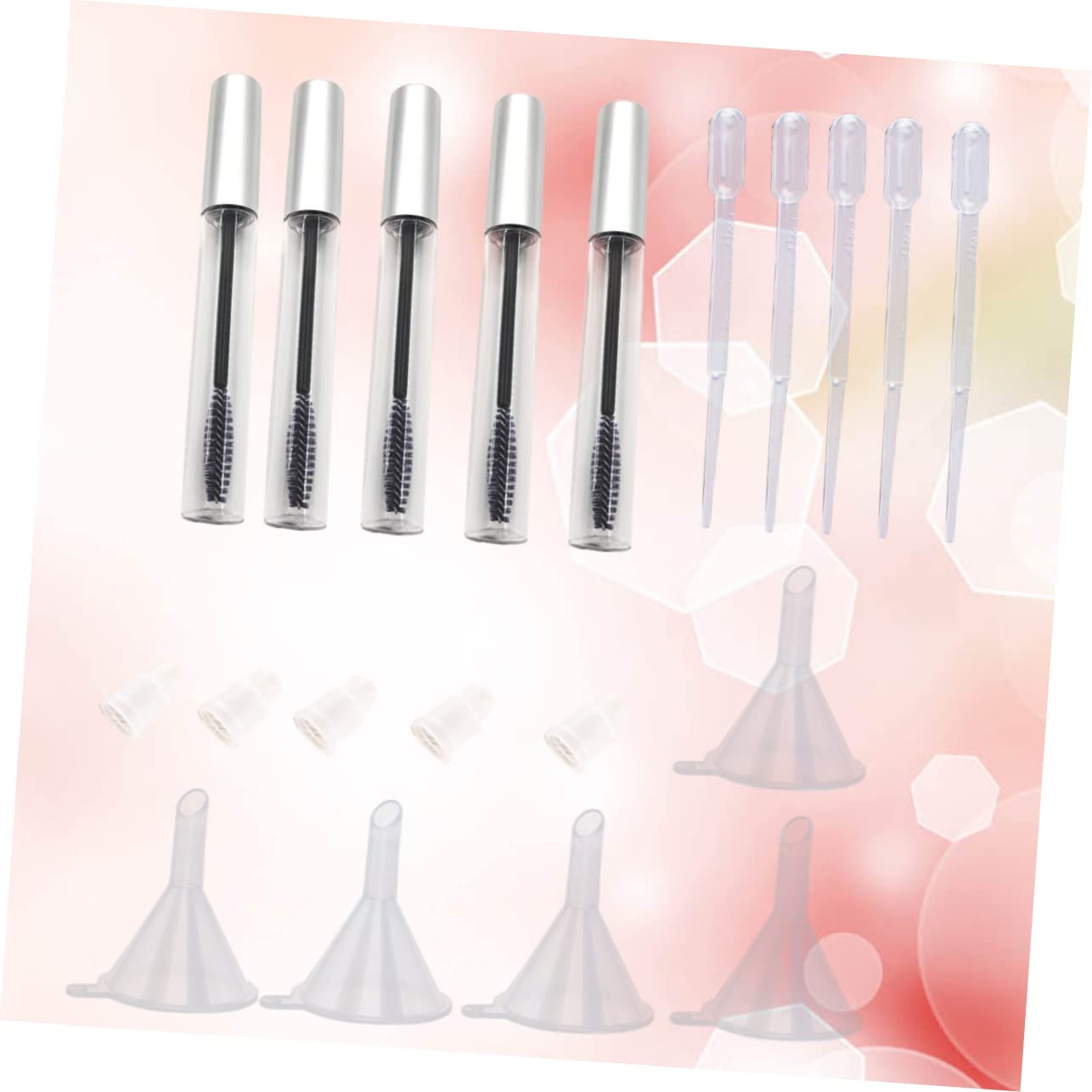 Eyelash brush bottle set: package includes 5 pack empty mascara tube with brush, 5 pack funnels and 5 pack transfer pipettes, enough for spare or replacement,lip gloss tubes with,mini cream containers