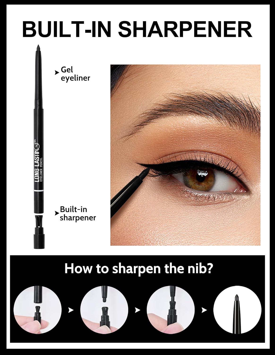 • 【SHARPENABLE EYELINER PENCIL】Use the built-in sharpener to keep the tip on point for expert precision. It creates Bold & Defined Lines, you can enhance your eye shape to your heart's content