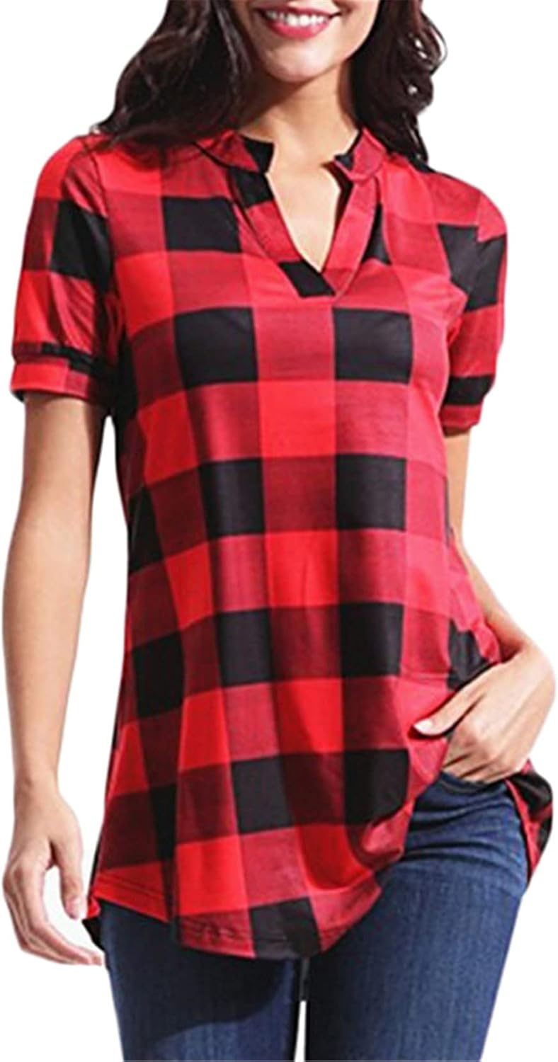 Andongnywell Womens Short Sleeve Shirt Plaid V Neck Loose Tunic Casual Tee Plaid Printed Blouses Tops