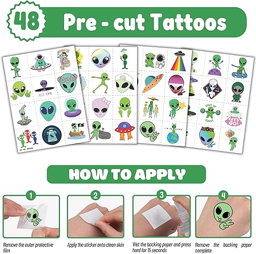 ALIEN-THEMED PARTY FAVORS 72PCS VALUE SET Includes 24 colorful slap bracelets and 48 pre-cut temporary tattoos with fun outer-space alien designs. Perfect for party favors, goody bags, classroom rewards, and scifi themed game prizes.