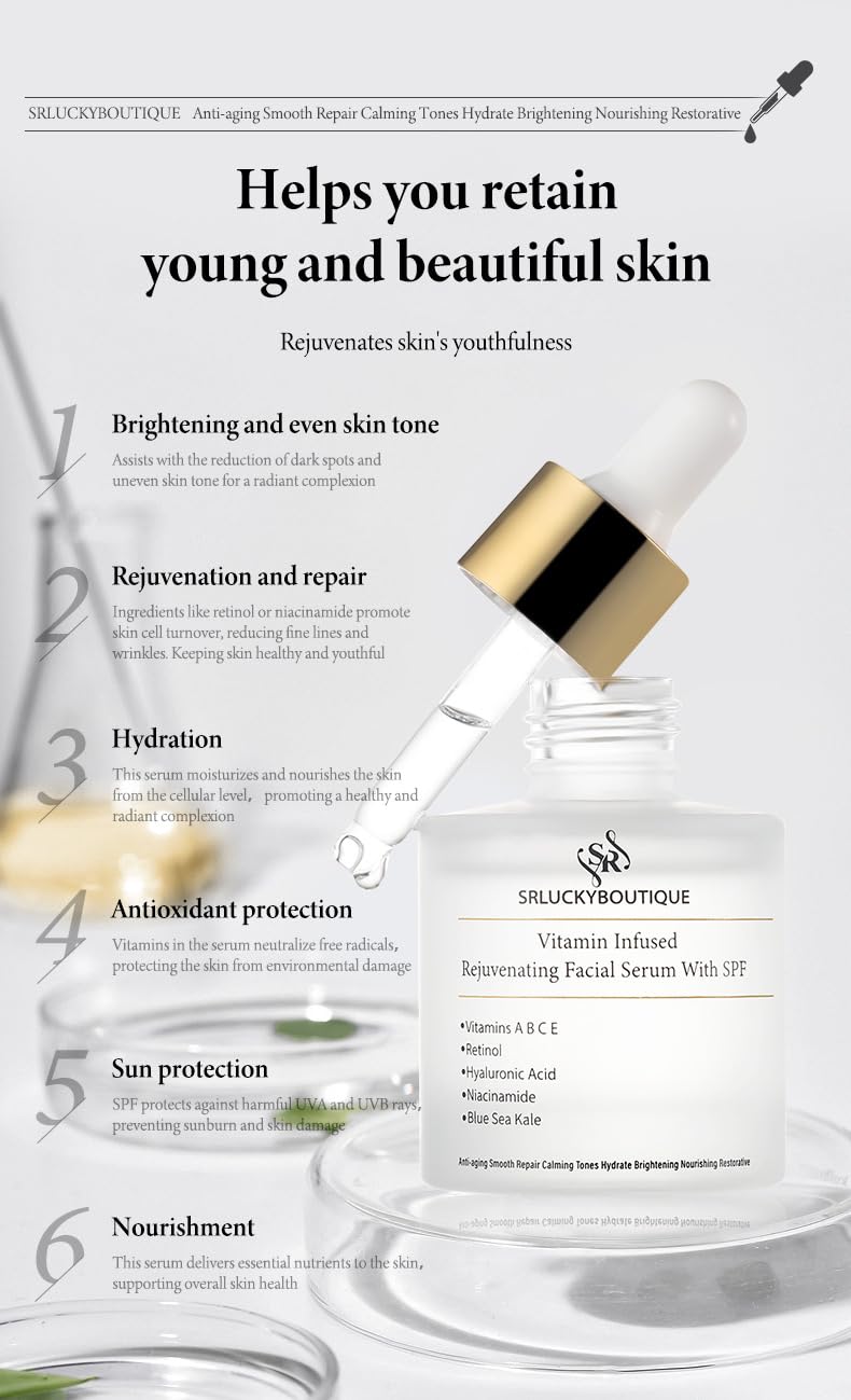 - Vitamin infused serum included Vitamin Infused Rejuvinating Facial Serum SPF-Anti aging formula- Brighten Skin- Even skin tone- Advanced hydration- Multi action serum- Vitmain infused- Nourish skin- Collagen and Elastin production