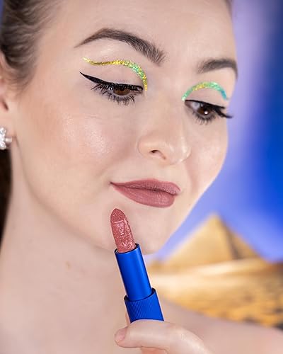 Egyptian Queen lipsticks features three wearable shades in a clean, non-toxic formula infused with skin-loving ingredients like hyaluronic acid, vitamin E, castor, and silk oils, known for their moisturizing, nourishing, antioxidizing properties. Experience a buttery-smooth, non-drying feel with a soft matte finish while delivering high color payoff in just one swipe. The bullet showcases an intricate embossing of an Egyptian scene. Components are crafted from aluminum with a magnetic closure.