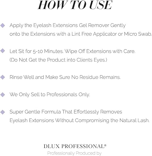 How to Use - Apply the Eyelash Extensions Cream Remover Gently onto the Extensions with a Lint Free Applicator or Micro Swab. Let Sit for 5-10 Minutes. Wipe Off Extensions with Care. (Do Not Get the Product into Clients Eyes.) Rinse Well and Make Sure No Residue Remains. We Only Sell to Professionals Only. Super Gentle Formula That Effortlessly Removes Eyelash Extensions Without Compromising the Natural Lash.