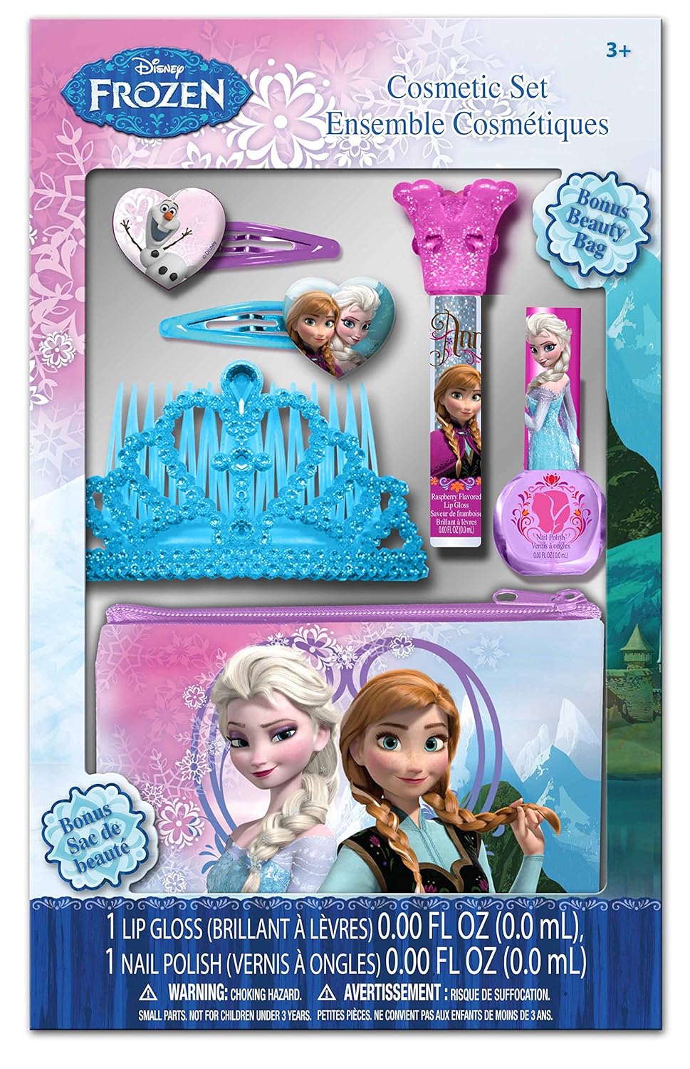 Also Includes: Bubble Gum scented Nail Polish; Crown Top Raspberry Flavored Lip Gloss; Frozen character hair clips