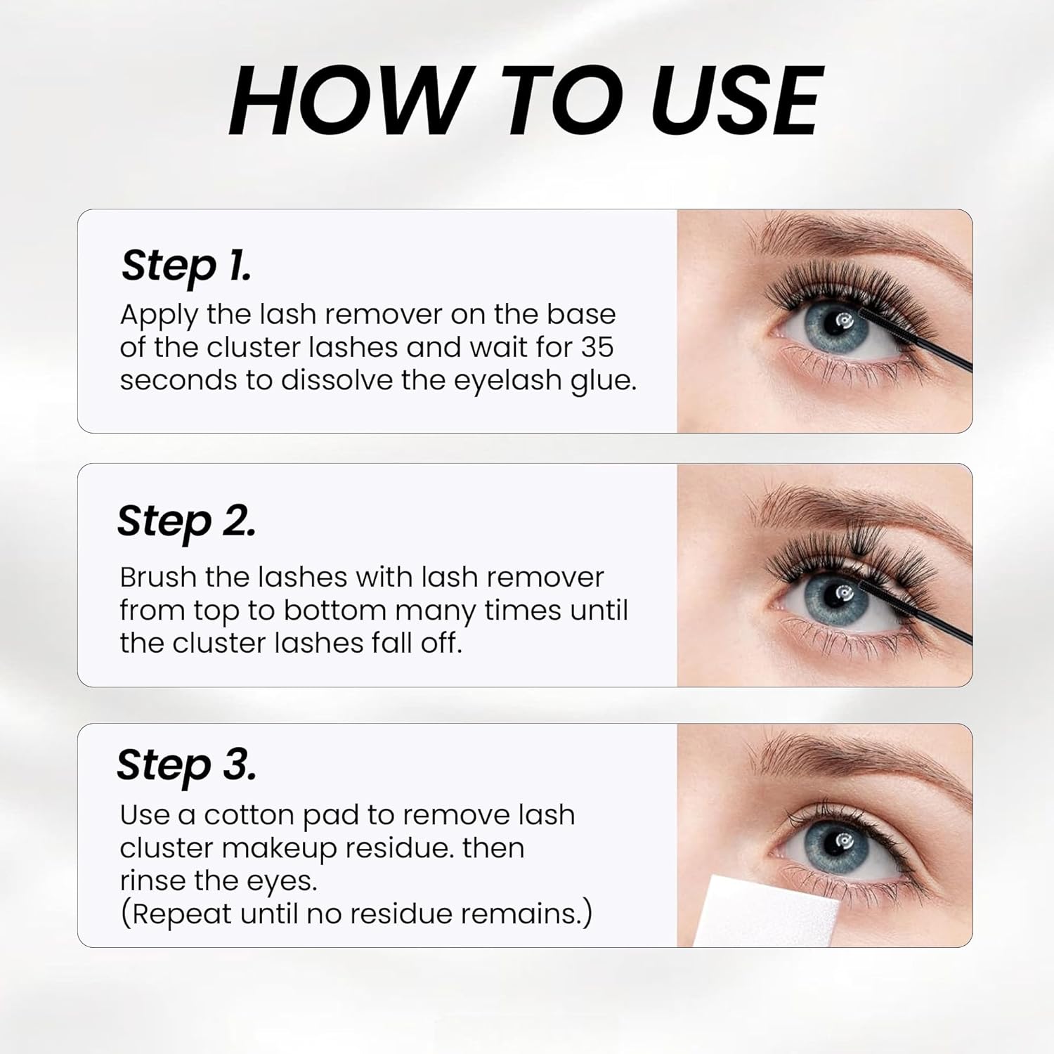 【HOW TO USE】: Apply lash remover to the base of the lash clusters where the glue is, and wait 40 seconds for the glue to dissolve. Gently brush the lashes with the remover, moving from top to bottom several times until the clusters detach. Use a cotton pad to wipe away the lash clusters and any cosmetic residue, then rinse your eyes thoroughly to remove all traces.