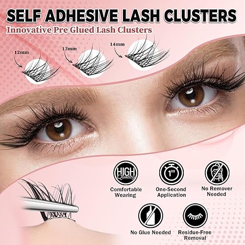 Innovative Pre Glued Lash Clusters: The self adhesive eyelashes stick directly to natural lashes without glue. One second application, the pre-bonded eyelash clusters are user-friendly for beginners.