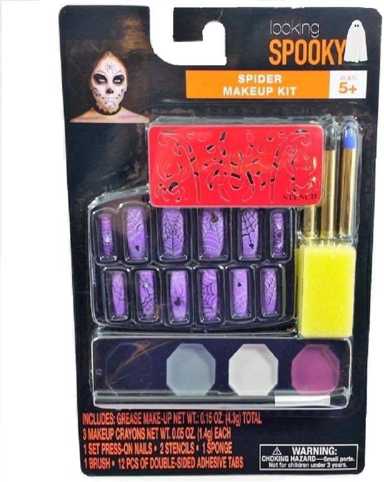 Spooky Spider Makeup Kit Includes (Stencils, Makeup, Press On Nails and Makeup Crayons)