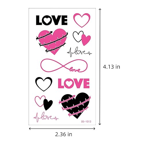 Glow In The Dark Temporary Tattoo Sticker: Pink heart shape fake tattoos are normal pink during the day, glowing pink shimmer at night when absorbing light sources, and will glowing again under UV light