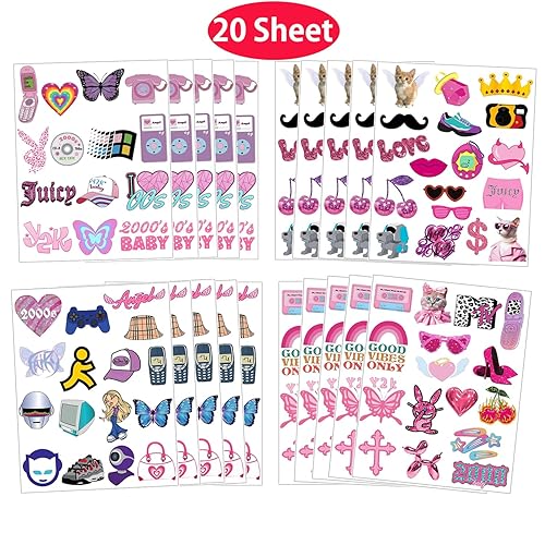 Y2K Temporary Tattoos - You will get 20 sheets of vintage throwback to 2000s tattoos in 4 styles, 5 sheets for each style; The quantity and styles are enough to meet your needs and replacement of decorations.