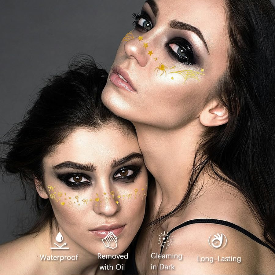 Safe & High Quality: Made from premium, non-toxic materials, our Halloween tattoos are safe for both kids and adults. The gold glitter finish is bright, eye-catching, and durable enough to last throughout your celebrations.