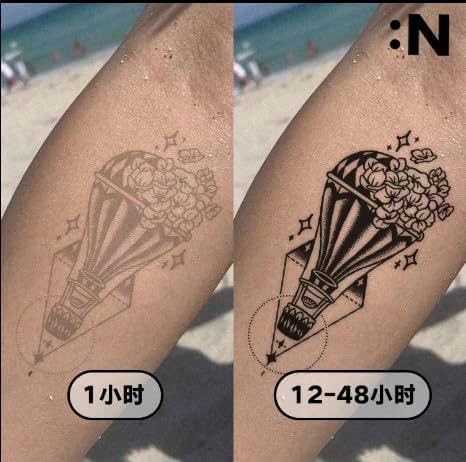 How to use: Simply place the fake tattoo sticker on your skin and hold it with a wet sponge for about 15 seconds, then remove! The color will appear lighter at first but will gradually darken over 24-48 hours.