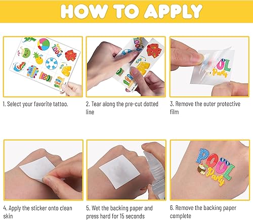 Simple Application: With just a few easy steps, your child can apply these tattoos effortlessly. Tear off the tattoo of choice and remove clear sheet. Place tattoo face down on skin. Wet the tattoo thoroughly. After 15-20 seconds, gently remove the backing paper. Allow the tattoo to dry. These delicate stickers are usually retained all days and can be cleaned with baby oil or hand sanitizer.
