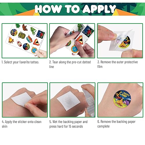 Perfect Camp Camping Birthday Decorations: All the temporary tattoos are design with many themed. Fits any smooth part: face, hands, arms, shoulders, back, legs water bottle, cup,mug and other stuff and so on. Great fun for party favors, birthday gift, clubs, festivals or party supplies,etc. and can be used by children, kids, girls, boys, women, men.
