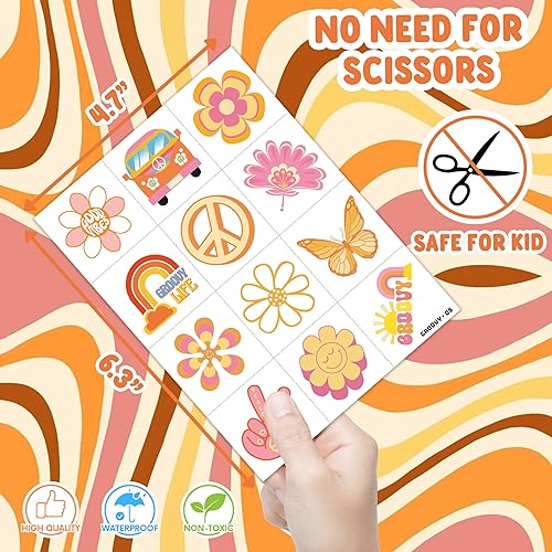 Package Includes: 5 Sheets One Two Groovy Retro Hippie Daisy Flower Rainbow 60s 70s Peace Butterfly temporary tattoo, total 60 PCS different designs tattoos stickers. The sheets measures 6.3 inch X 4.7 inch, one size fit all adult and kids. Can meet most of your needs.