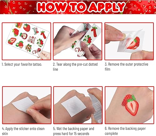 Package Includes: 5 Sheets Strawberry Berry First 1st Sweet One temporary tattoo, total 60 PCS different designs tattoos stickers. The sheets measures 6.3 inch X 4.7 inch, one size fit all adult and kids. Can meet most of your needs.