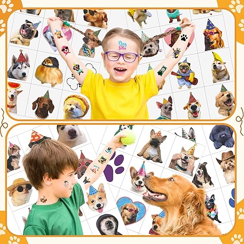Dog Tattoos Set: Each set include 96pcs individually temporary tattoos. They include many famous dog types such as: Golden Retriever, Yorkshire, Poodle, Chihuahua, German Shepherd, Shin tzu,... with diverse, adorable and unique expressions.