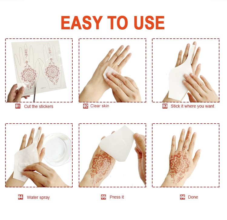6 Sheets temporary tattoos stickers. high-quality Sheet Size: 10.6x8.2 in Henna Tattoo Stickers, Long lasting and waterproof. They will not wash off and will last for 5-7days.