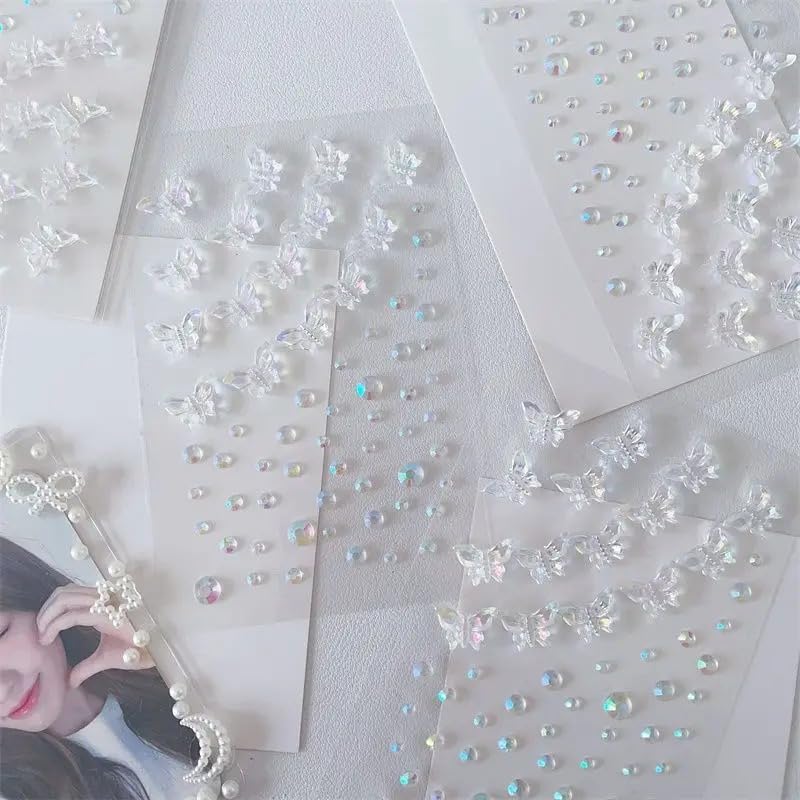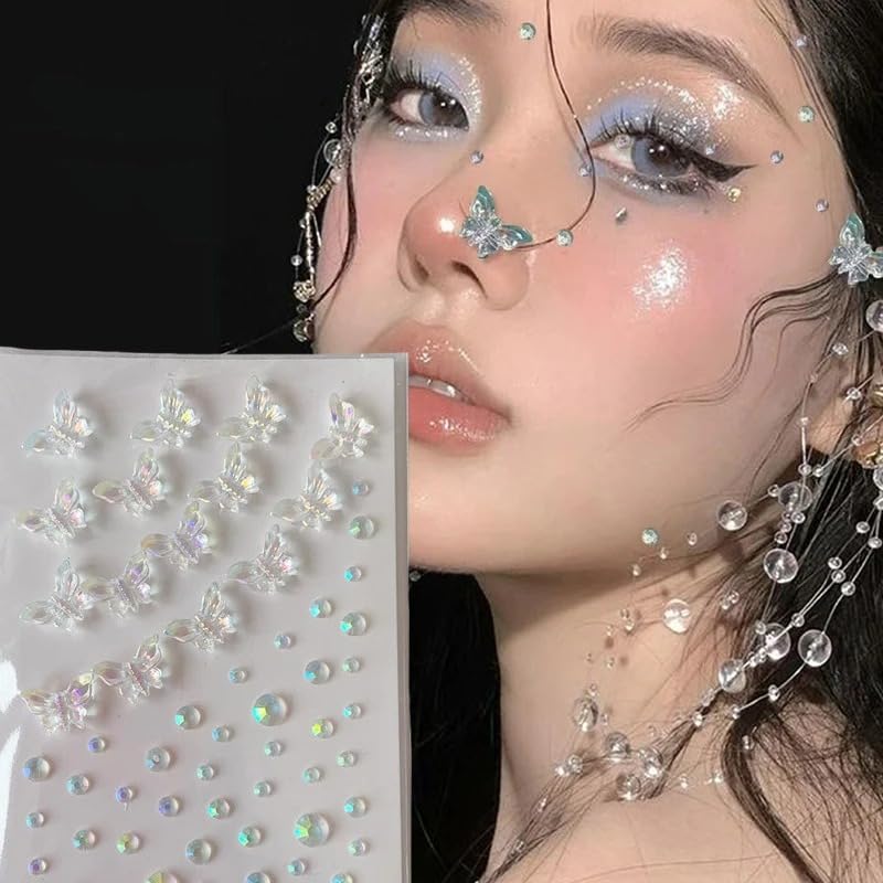 Butterfly face jewels – Eye-catching butterfly-shaped crystal designs enhance your facial features for parties or photo shoots.