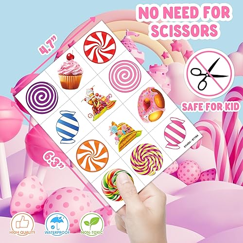 Candyland Party Supplies: 5 Sheets 60 PCS Candyland Pre-Cut temporary tattoos stickers, Have a variety of themed color, Children can easily Candyland stickers and take unique photos to make fond memories. The size of each sheet is 6.3 * 4.7 inches.