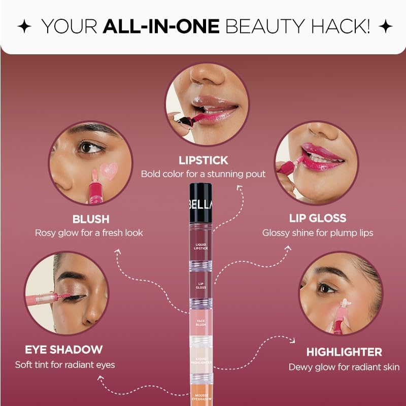 High Five 5-in-1 Face Glam lets you switch effortlessly between mousse eyeshadow, luminous highlighter, glossy lips, vibrant lipstick, and fresh liquid blush.