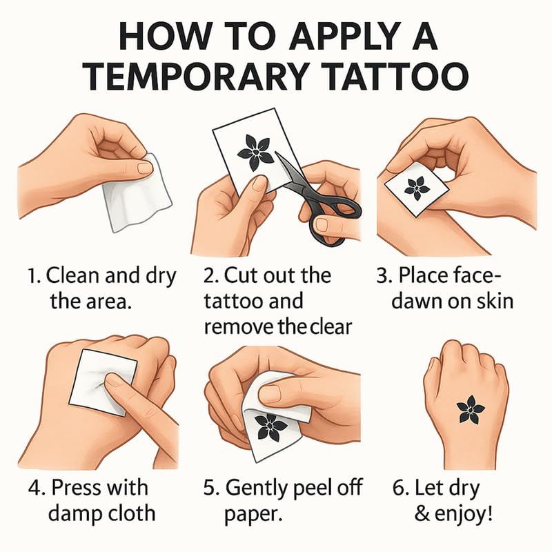 INSTRUCTIONS FOR USE: Custom tattoos temporary are easy to apply. Place the tattoo face-down on clean skin, press with a wet cloth for 30 seconds, then peel off the backing and let it dry.