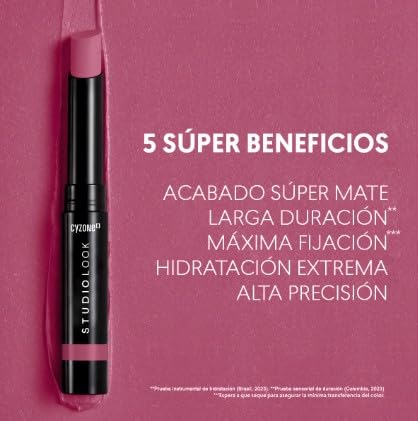 • Get a stunning look with Studio Look's Supermatte Lipstick! With 5 super benefits you'll love: A super matte finish for soft lips, long-lasting, extreme hydration for up to 24 hours (*), maximum hold (**), and precision with its slim, thin-tip format. Try it with all your looks!