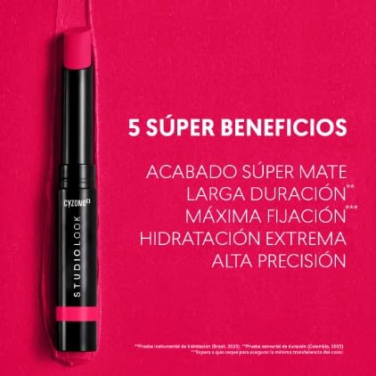 Get a stunning look with Studio Look's Supermatte Lipstick! With 5 super benefits you'll love: A super matte finish for soft lips, long-lasting, extreme hydration for up to 24 hours (*), maximum hold (**), and precision with its slim, thin-tip format. Try it with all your looks!