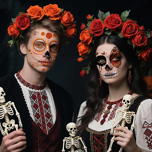 Day of the Dead Marigold Flowers Full Face Tattoos: You will get 2 sheets Butterfly Marigold Flowers temporary Tattoos and 2 sheets Black Orange Diamond stickers Tattoos for Kids Adults, in 2 different chilling designs. Our Dia De Los Muertos Face Stickers are most suitable for festival, Day Of The Dead, Halloween or Christmas.