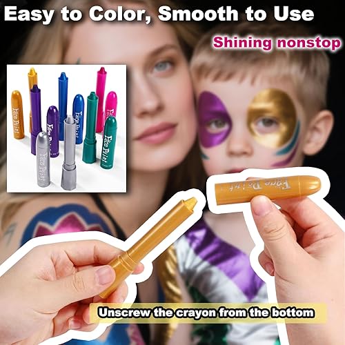 Shimmering Metallic Color: Glitter face paint crayons are designed for face and body painting, including 6 colors, high-quality and skin-friendly. The temporary glitter body painting pens create stunning, dazzling effects, delivering vivid metallic tones for exquisite body painting designs