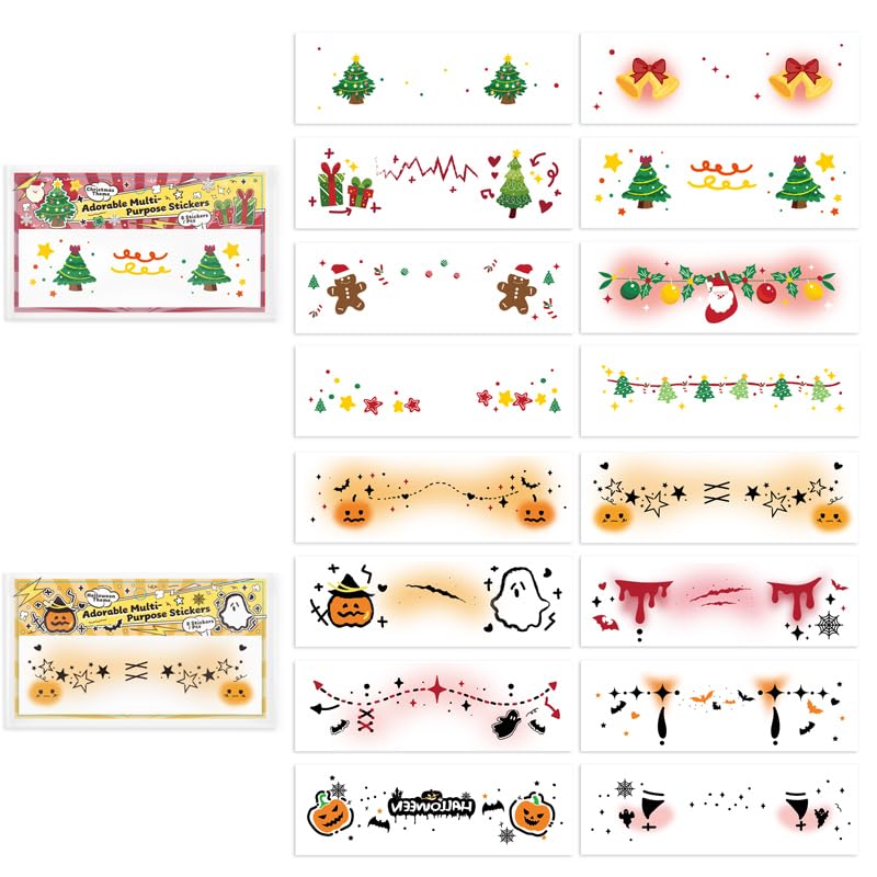 Festival Design: 8 stickers per pack with a holiday theme, featuring Christmas trees, bells, pumpkins, ghosts, and seasonal decorative elements