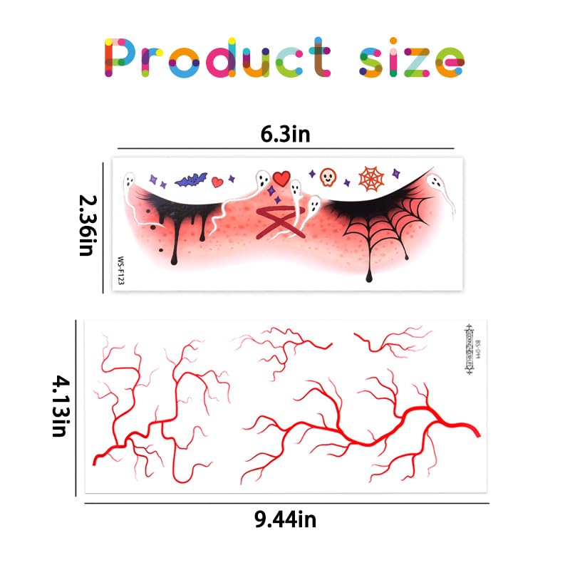 Size of Halloween Skull Face Decals Stickers: The size of the spider web stickers for women female is about 2.36in*6.3in, the size of the blood tattoo stickers temporary face for women is about 9.45in*4.13in, so this skull temporary tattoos adult perfect as halloween makeup accessories for women girls, halloween makeup decals, halloween eyeshadow makeup stickers for women