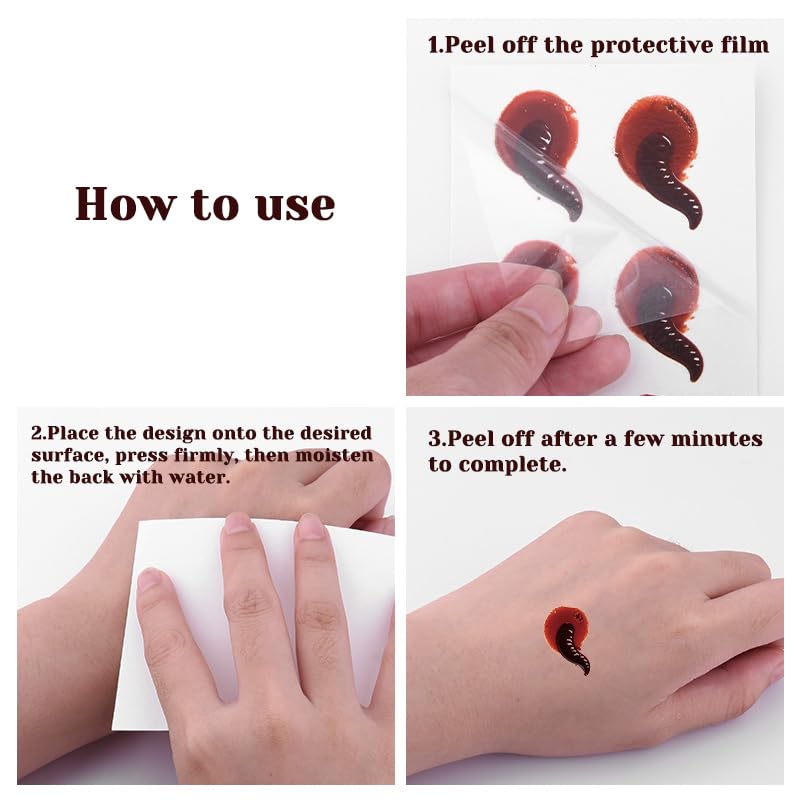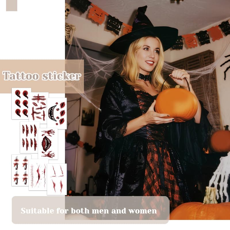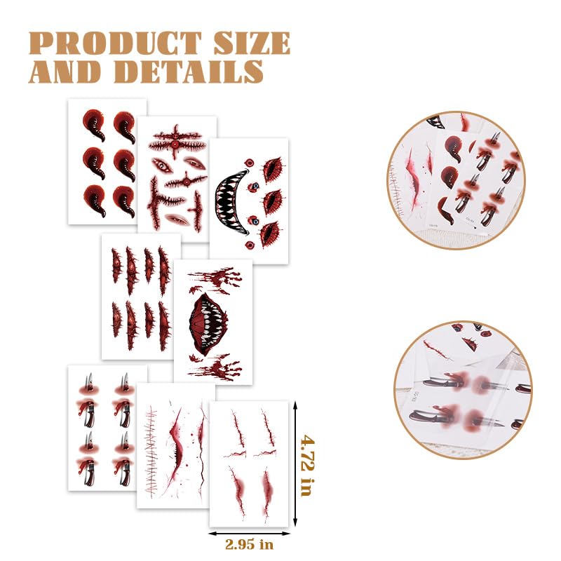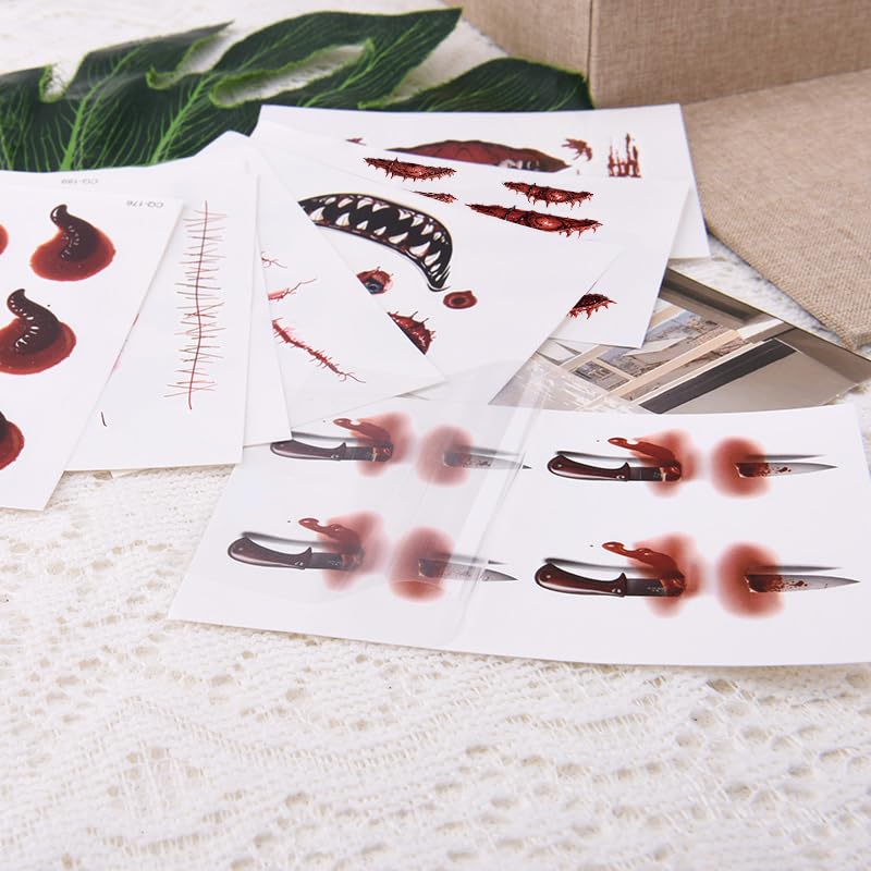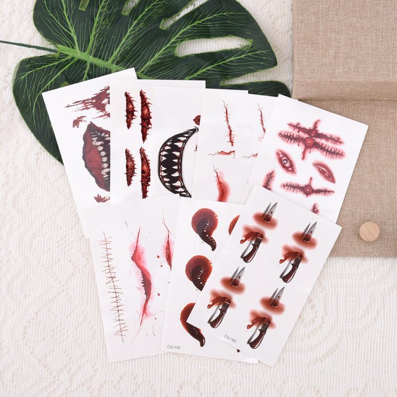 Perfect Design of Wound Simulation Tattoo Stickers: There are 8 different wound tattoo sticker for you to choose from, and if you add simple makeup around them, the Halloween fake tattoos look very realistic, do not touch before it dries completely, do not touch before it dries completely and not come into contact with water for 2 hours as the pattern will last longer, the fake stitches tattoo is injury face scars tattoo, spooky body stickers for girls boys