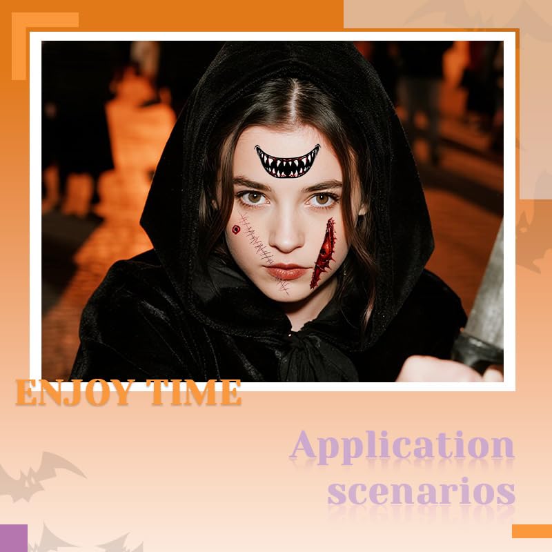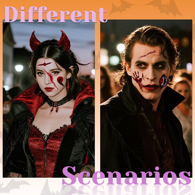 Widely Application of Injury Face Scar Makeup: The spooky body stickers are great for Halloween cosplay costume, Zombie costume for Halloween parties, Halloween party favor, goodie bag favors, birthday party supplies haunted houses, or special effects makeup for movies and theater productions, spooky body sticker for adults kids, horror scary body stickers halloween