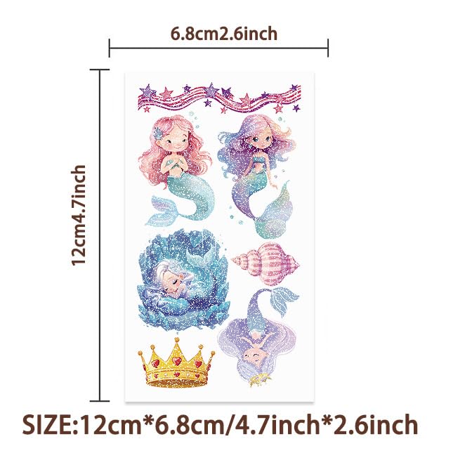 Magical Mermaid Tattoo Set: Includes 10 Sheets Of Temporary Tattoos with Stunning Mermaids, Sea Turtles, Colorful Fish, Seashells, and Sparkling Bubbles in Vibrant Ocean Colors.