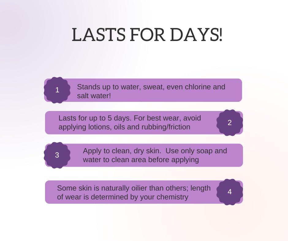 Lasts up to 7-days even after work-outs, sun exposure and swimming in salt and chlorine.
