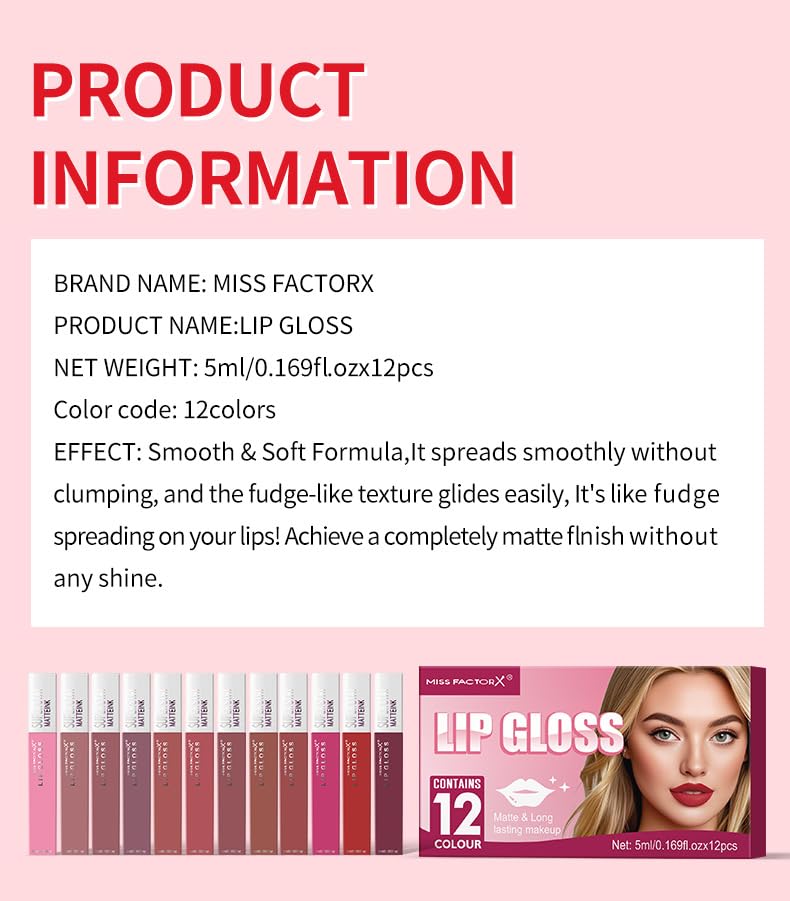 VIBRANT COLLECTION: Set includes 12 distinct matte lip gloss shades perfect for creating versatile makeup looks from natural to bold