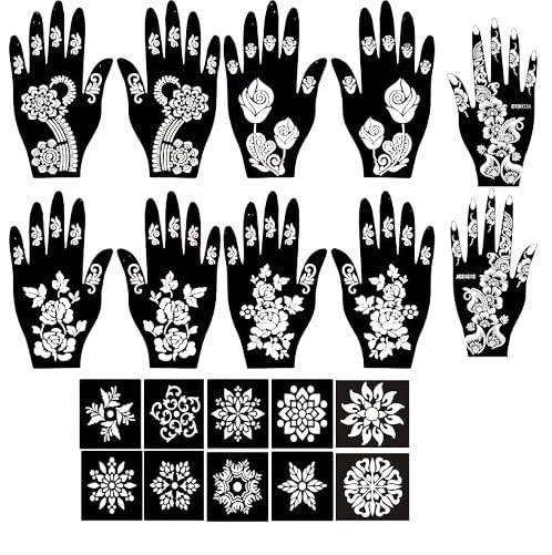Henna Tattoo Stencils Kit: (Pack Of 20) Included 10 Sheets Self-adhesive Hand Stencils,each measurement approximately 7 x4 inches and 10 round stencil pvc Premium Quality: These henna tattoo templates are made of high-grade PVC, tough and durable;