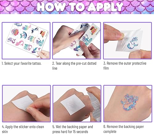 Package Includes: 5 Sheets Purple Little Mermaid Mermaids Tail Starfish Seashells Holographic Jellyfish Princess temporary tattoo, total 60 PCS different designs tattoos stickers. The sheets measures 6.3 inch X 4.7 inch, one size fit all adult and kids. Can meet most of your needs.